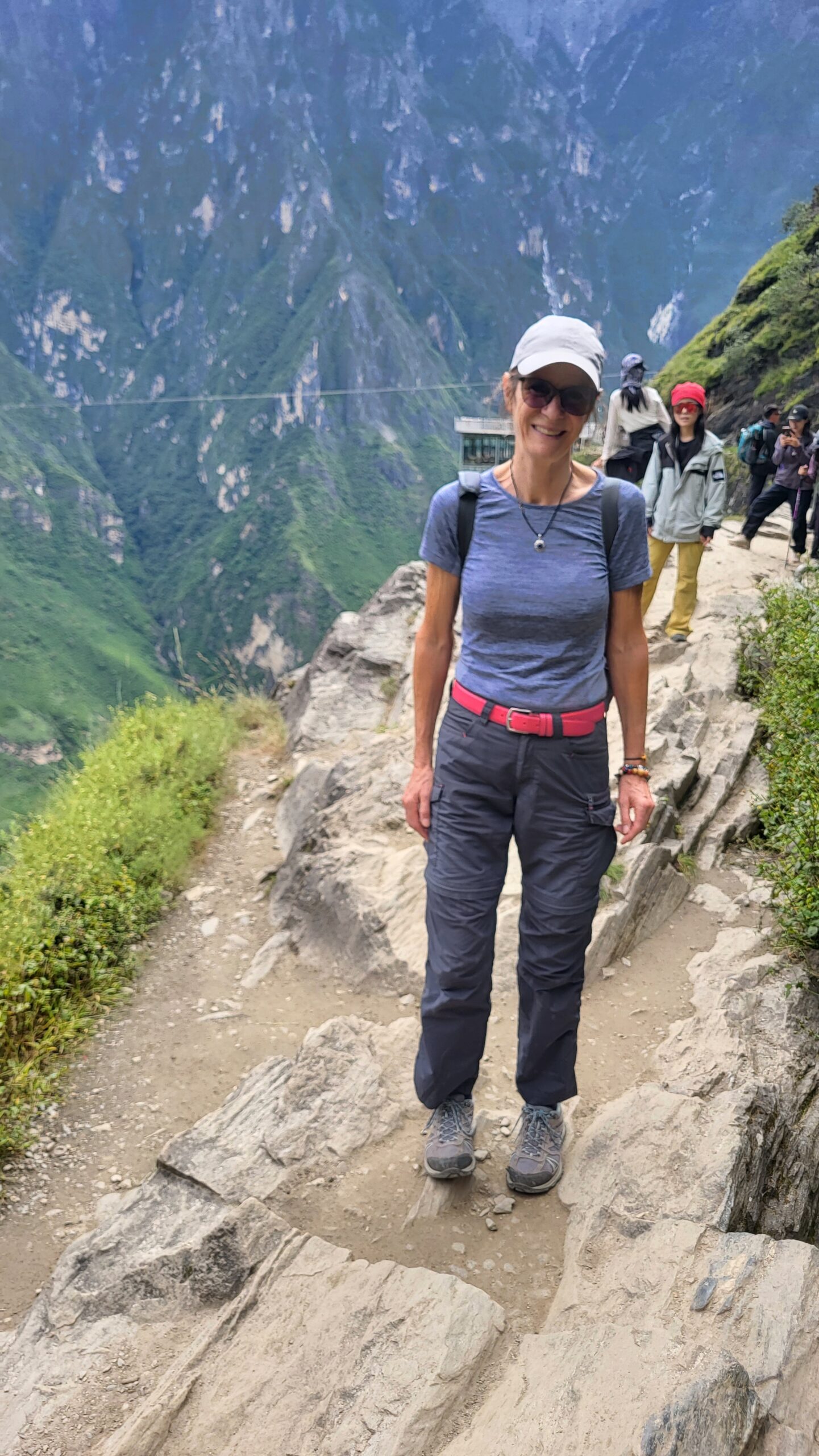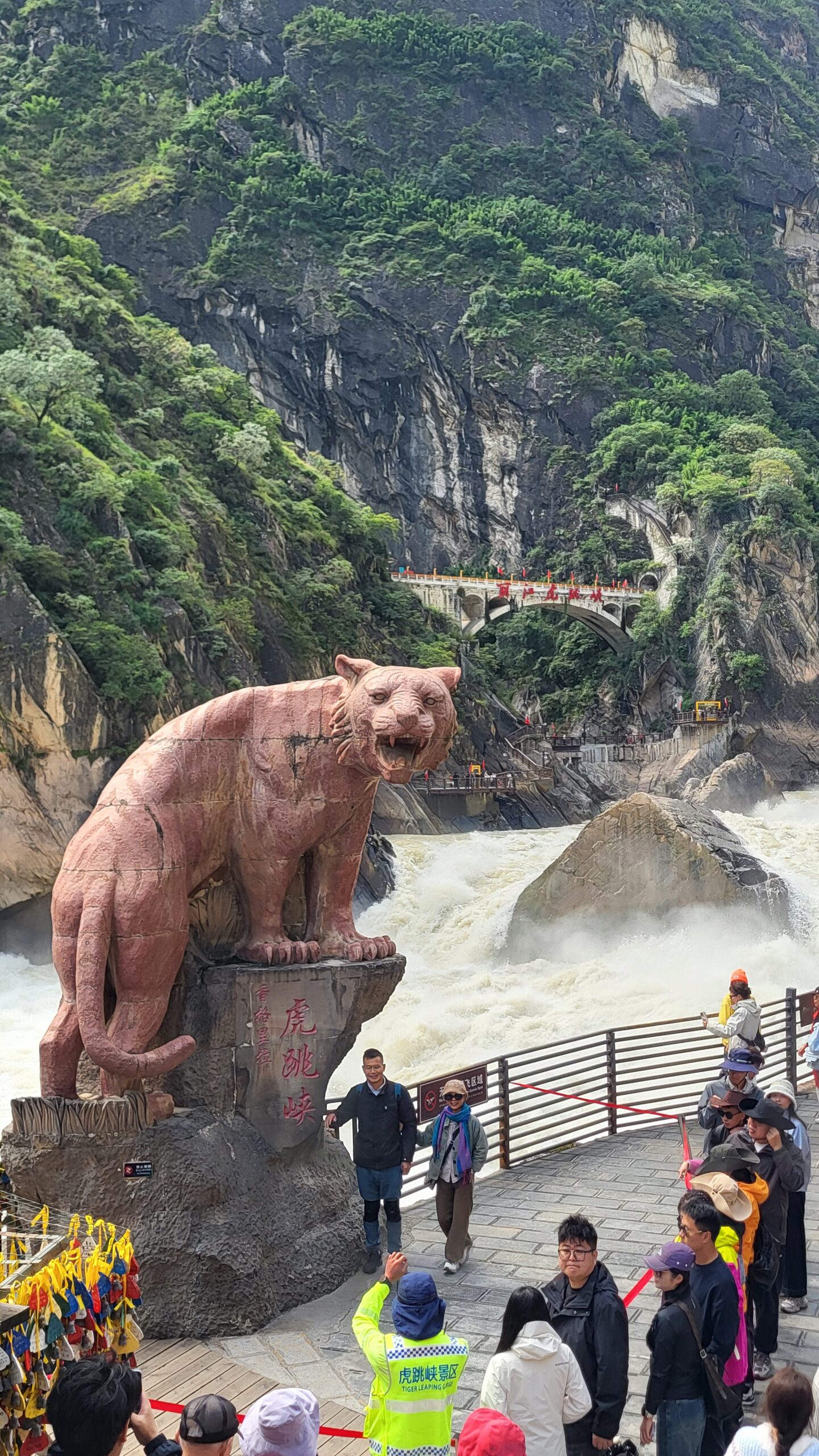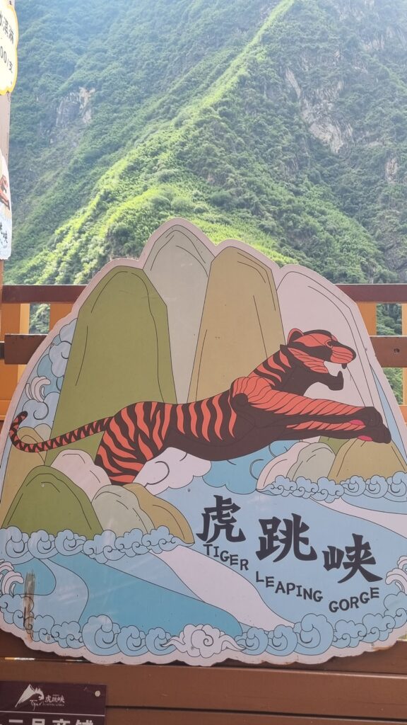 Heute machen wir einen Ausflug und  wollen sehen, wo ein Tiger einen wilden Fluß übersprungen haben soll. Dazu geht es erstmal 80 km mit dem Bus (6 €/Pers.) weiter nördlich in die Berge. Am Ort der Legende ist sogar ein Denkmal und eine große Aussichtsterrasse gebaut worden. Unten fließt der Jinsha-Fluss, der Oberlauf des Jangtsekiang, der mit 6.900 km (3.915 meilen) der längste Fluss Chinas ist und der trotz seiner riesigen Länge, NUR in China fließt.